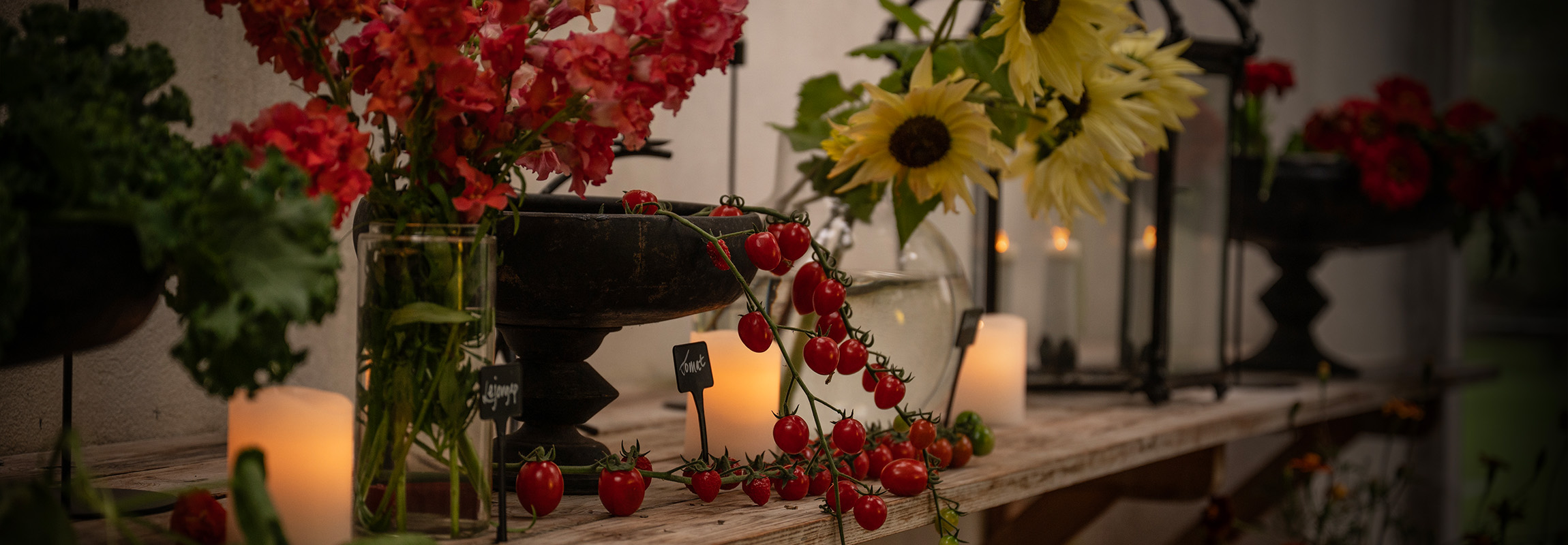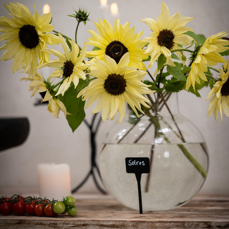 25. Luktärt 'Mammoth' + Miniatyrsolros 'Soluna Lemon' + Rosenskära 'Apricotta'