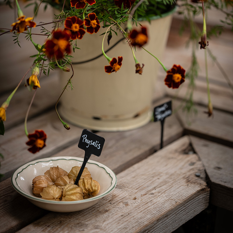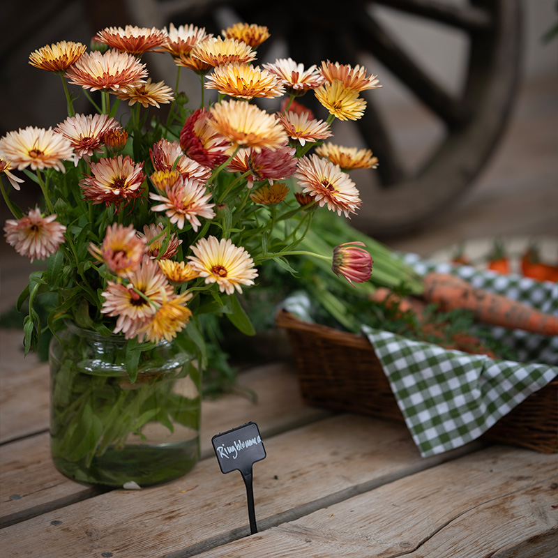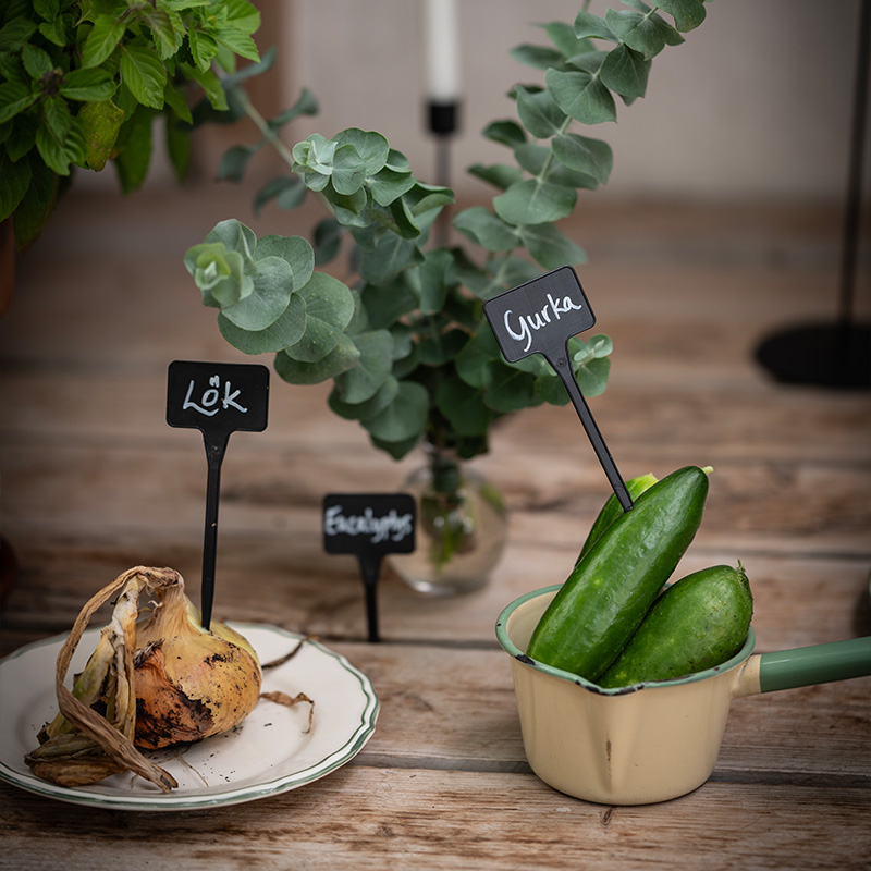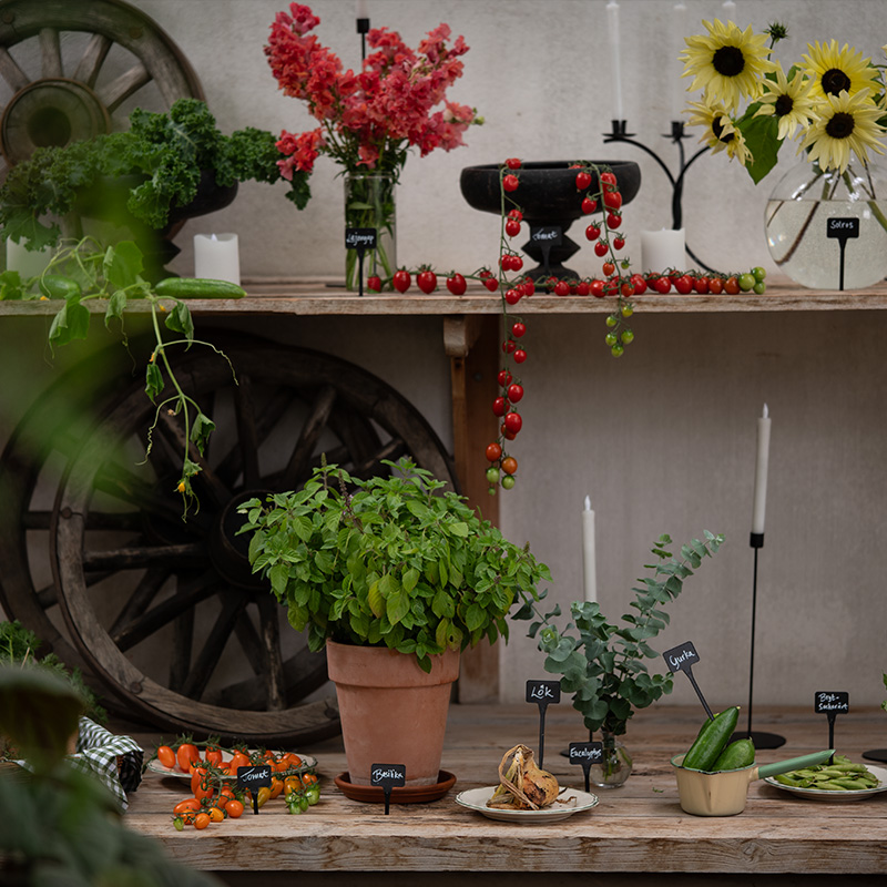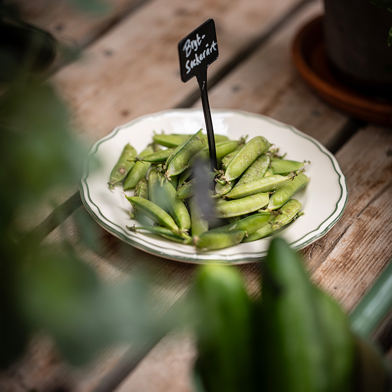1. Bindsallat 'Little Gem' + Sommarmorot 'Amsterdam 3' + Ringblomma 'Orange Flash' + Brytsockerärt 'Delikett'2. Växthusgurka F1 'Picolino' + Eukalyptus 'Baby Blue' + Sommarmorot 'Touchon'