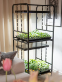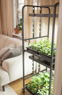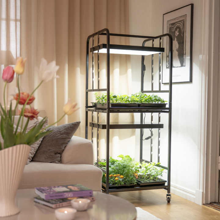 Mobil odlingsvagn för enkel odling året om. Inbyggd växtbelysning till varje våningsplan. Stilren design och lättplacerad med stadiga hjul. Perfekt att odla i året om. Skräddarsydda minidrivhus med odlingstråg ingår.